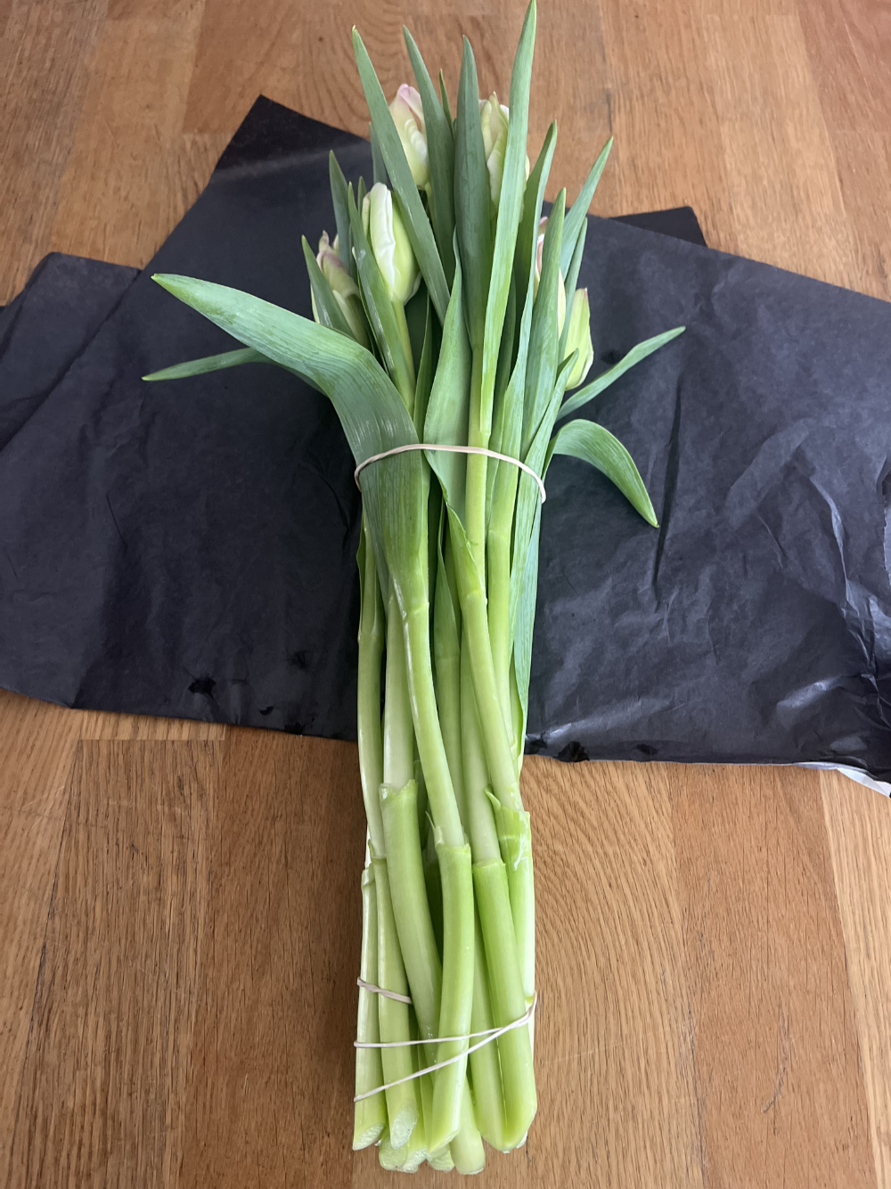 When you receive your tulips, they will have rubber bands on them, one at the bottom and one at the top. Keep the rubber bands on, but remove the paper.