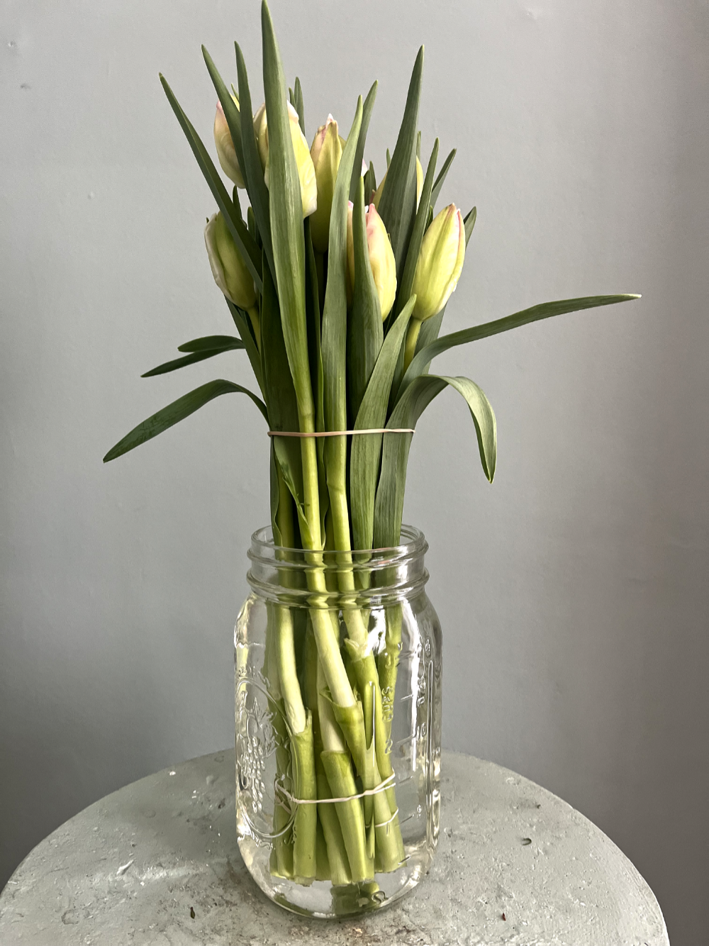 Once the stems have firmed up you can remove the rubber bands. It can take up to 4 hours. Keeping the rubber bands on will prevent the tulips from curling. It isn't a problem really, I think most people prefer a straighter stem is all.