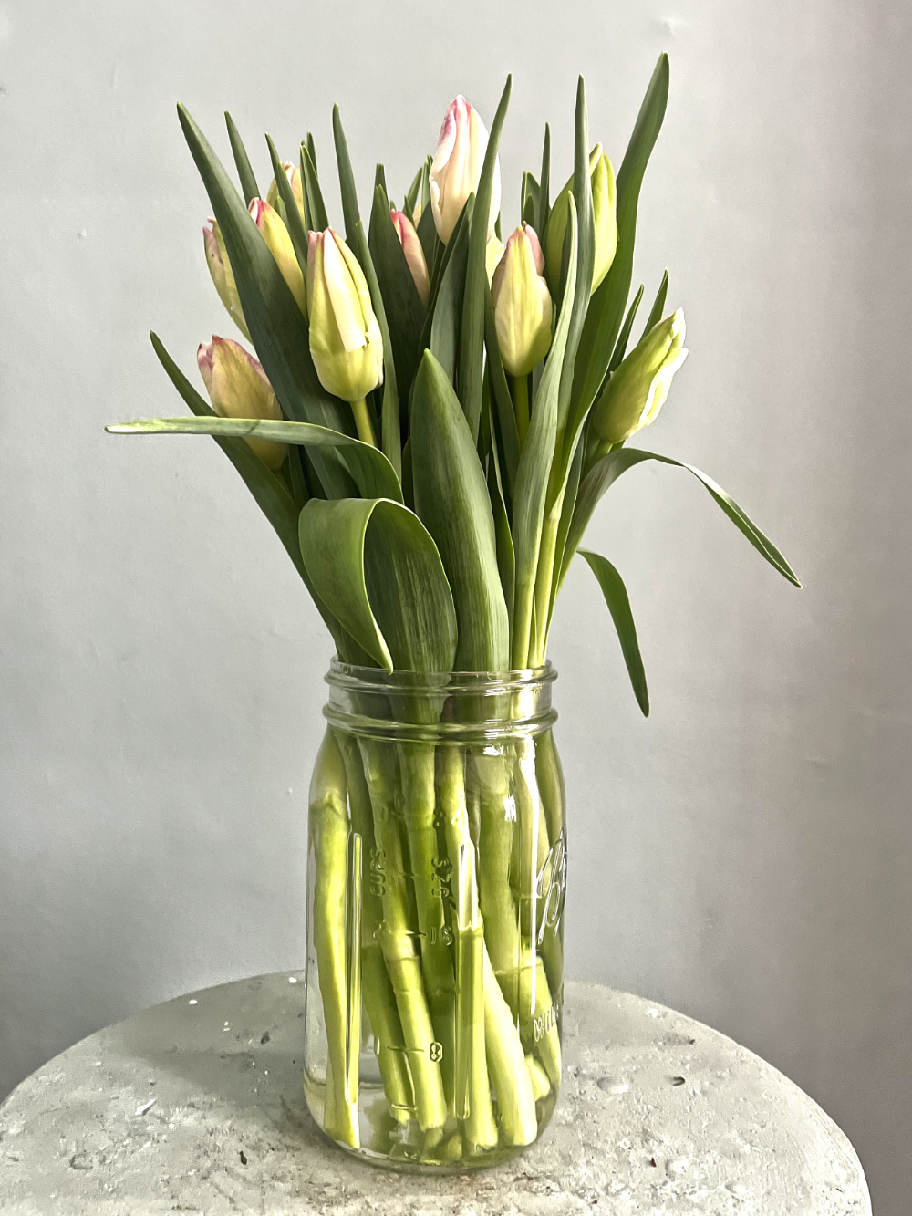Place the tulips in a tall heavy vase, or a quart mason jar would also be fine. Fill with cold water to the top and don't use flower food. Tulips drink a lot, and even absorb water through their entire stem, not just the cut end.